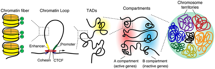 三维基因组结构,图片来自Frontiers in Cell and Developmental Biology, 2021, doi:10.3389/fcell.2020.626541。