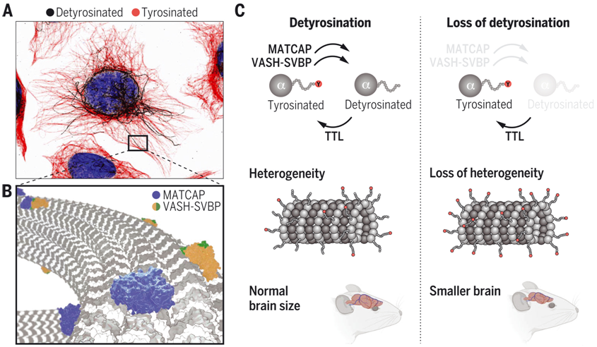 微管蛋白去酪氨酸化是由不同的MATCAP和vasohibin去酪氨酸酶进行的。图片来自Science, 2022, doi:10.1126/science.abn6020。