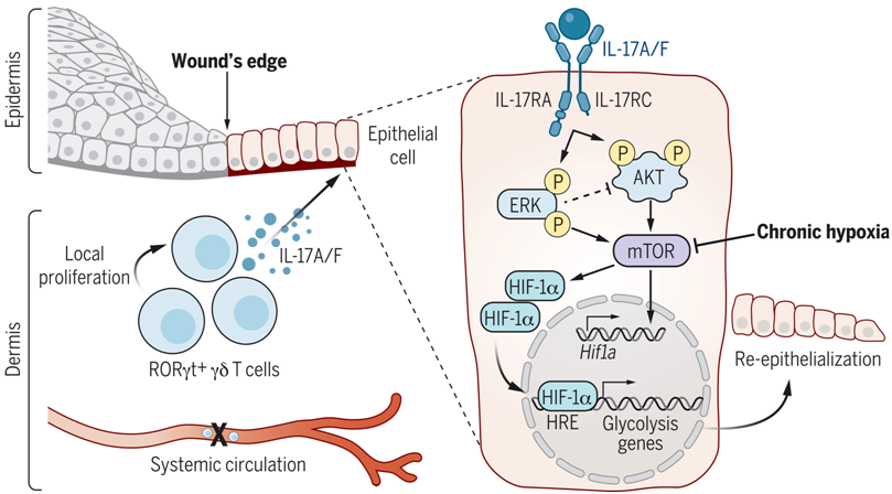 上皮修复需要细胞通过进化上保守的缺氧诱导因子(hypoxia-inducible factor, HIF)来适应缺氧的伤口微环境。长期以来,人们认为这种反应取决于上皮细胞对缺氧的自主感应和通过HIF的反应能力。然而,在上皮修复过程中,来自免疫细胞的支持性微环境信号是否以及如何与古老的缺氧反应相互作用,还有待于探索。为了解决这些问题,来自美国纽约大学的研究人员在一项新的研究中着重关注一类主要的上皮屏障---皮肤,它受到免疫细胞的监视,并已进化出复杂的修复机制。相关研究结果发表在2022年7月8日的Science期刊,论文标题为“Interleukin-17 governs hypoxic adaptation of injured epithelium”。