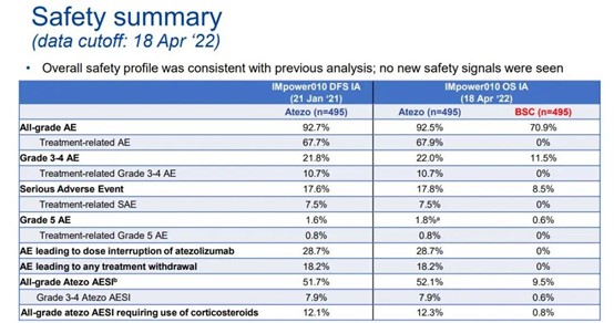 阿替利珠单抗组和BSC组患者中分别有22.0%和11.5%患者发生3-4级不良事件(AE),两组的5级AE发生率为分别为 0.8%和0%。在接受阿替利珠单抗治疗的患者中,52.1%发生特殊的AE;7.9%为3-4级,0.4%为5级(肺炎/间质性肺疾病和心肌炎)。DFS IA临床截止日期后未发生新的5级AE。