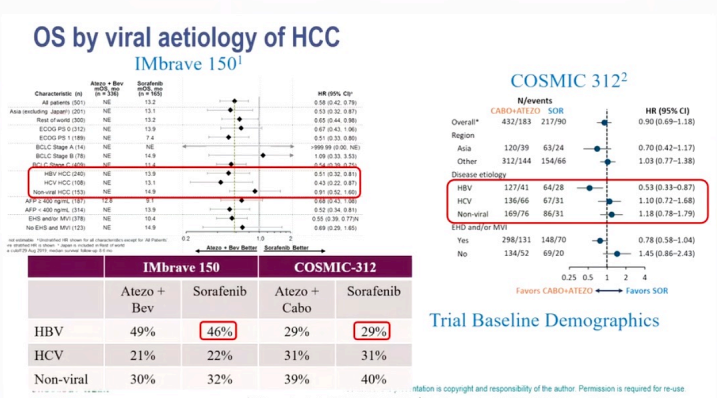 那这种情况,在COSMIC-312试验中也是如此。虽然整体OS数据是失败的,但在ITT人群的HBV亚组(n=191),卡博替尼+阿替利珠单抗组和索拉非尼单药组的mOS分别为18.2个月和14.9个月(HR 0.53;95%CI:0.33~0.87);在HCV亚组(n=203),两组的中位OS分别为13.6个月和14.0个月(HR 1.10;95%CI:0.72~1.68);在非病毒组(n=255),两组的中位OS分别为15.2个月和未达到(HR 1.18:95%CI:0.78~1.79)。也验证了HBV感染导致的HCC更能从免疫联合治疗中获益。